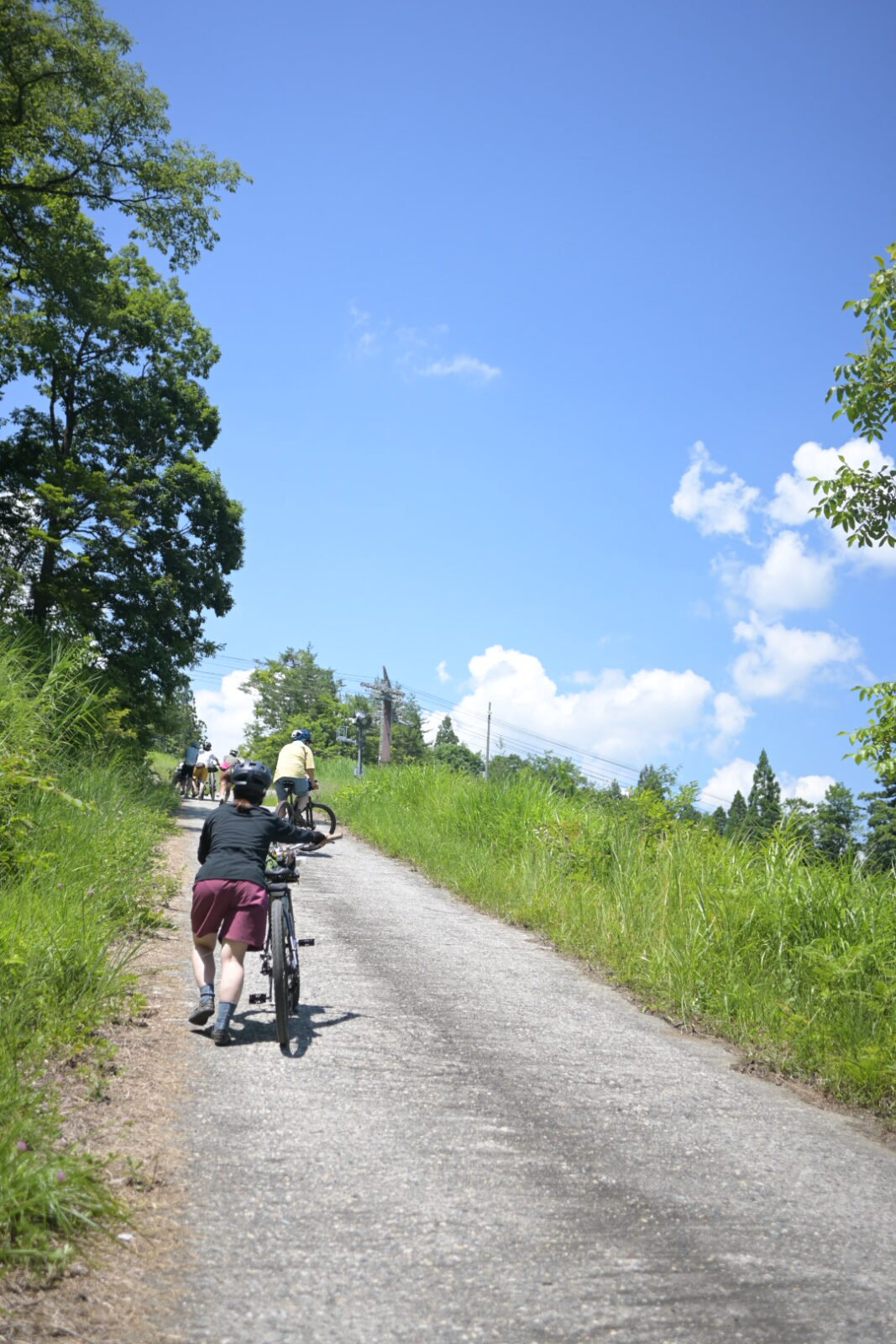 …とはいえ、さすがに足を着いてしまう場面もあり、重たい相棒を押しながら登ったりもして。笑