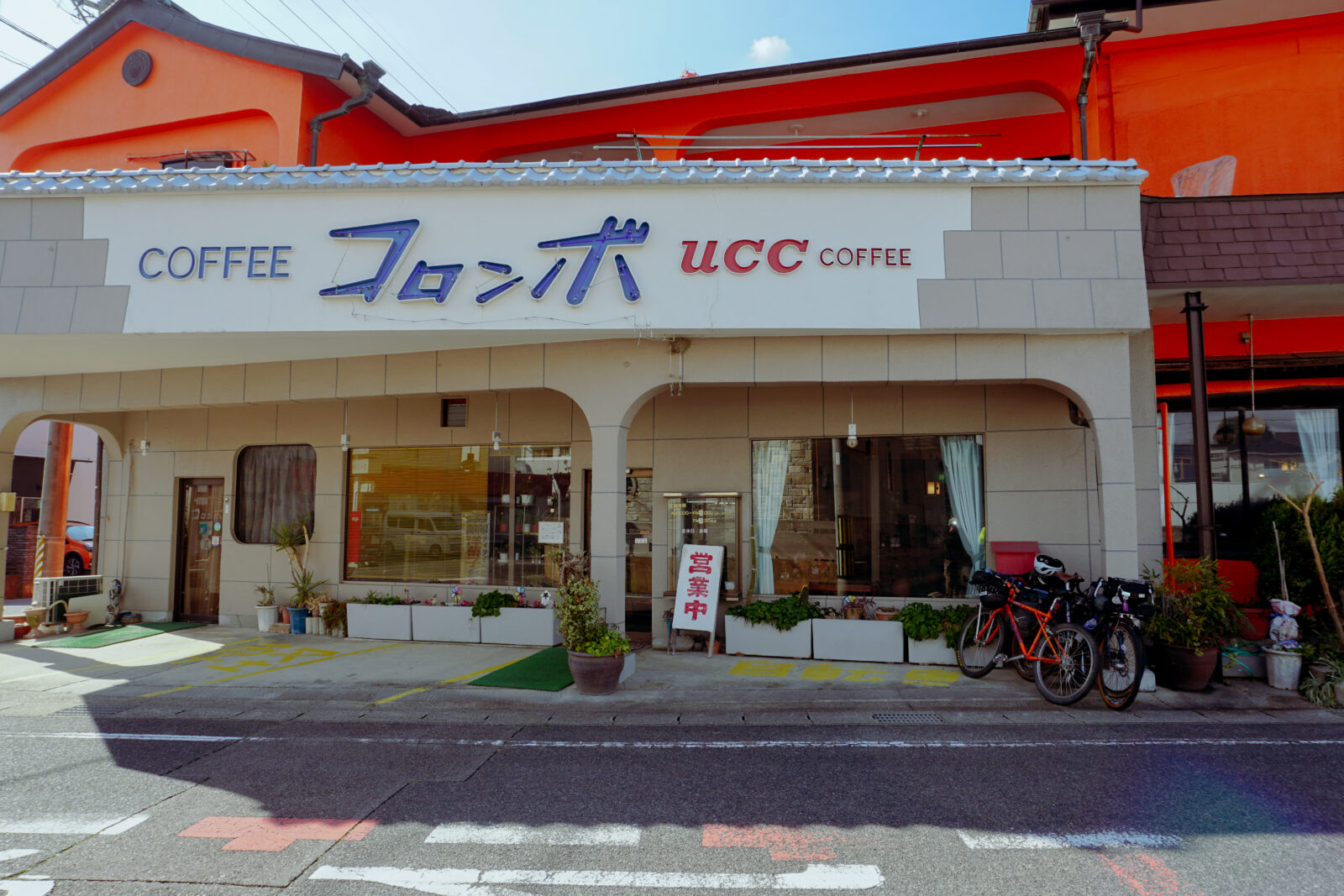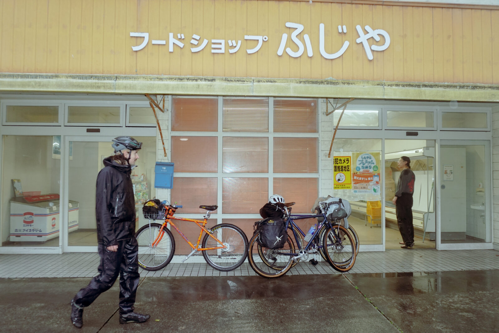 Alors que les grands immeubles se font plus rares et que la rivière guide notre chemin, les coups de cul de la ville font placent à de vraies montées dans la campagne sollicitant tous les muscles de nos corps endoloris. La pluie froide, elle, s’est frayé un chemin jusqu’au t-shirt en mérinos qui protège ma peau et me fait frissonner; mon ventre crie famine. Heureusement j’ai dit à mes compagnons de galère “En bikepacking c’est très important de manger avant d’avoir faim pour ne pas manquer d’énergie !”, faites ce que je dis, pas ce que je fais. Il est donc 13:00 quand nous décidons de nous arrêter pour une collation dans un des rares établissements encore ouvert dans cette région victime de la métropolisation. Le décor inspiré d’Okinawa, petite île ensoleillée du sud du Japon contraste beaucoup avec la météo et réchauffe nos âmes; les champignons frits et le riz au fèves de soja aussi. Vivant dans la simplicité sur nos vélos, un tel festin nous apparaît comme une vraie bénédiction.