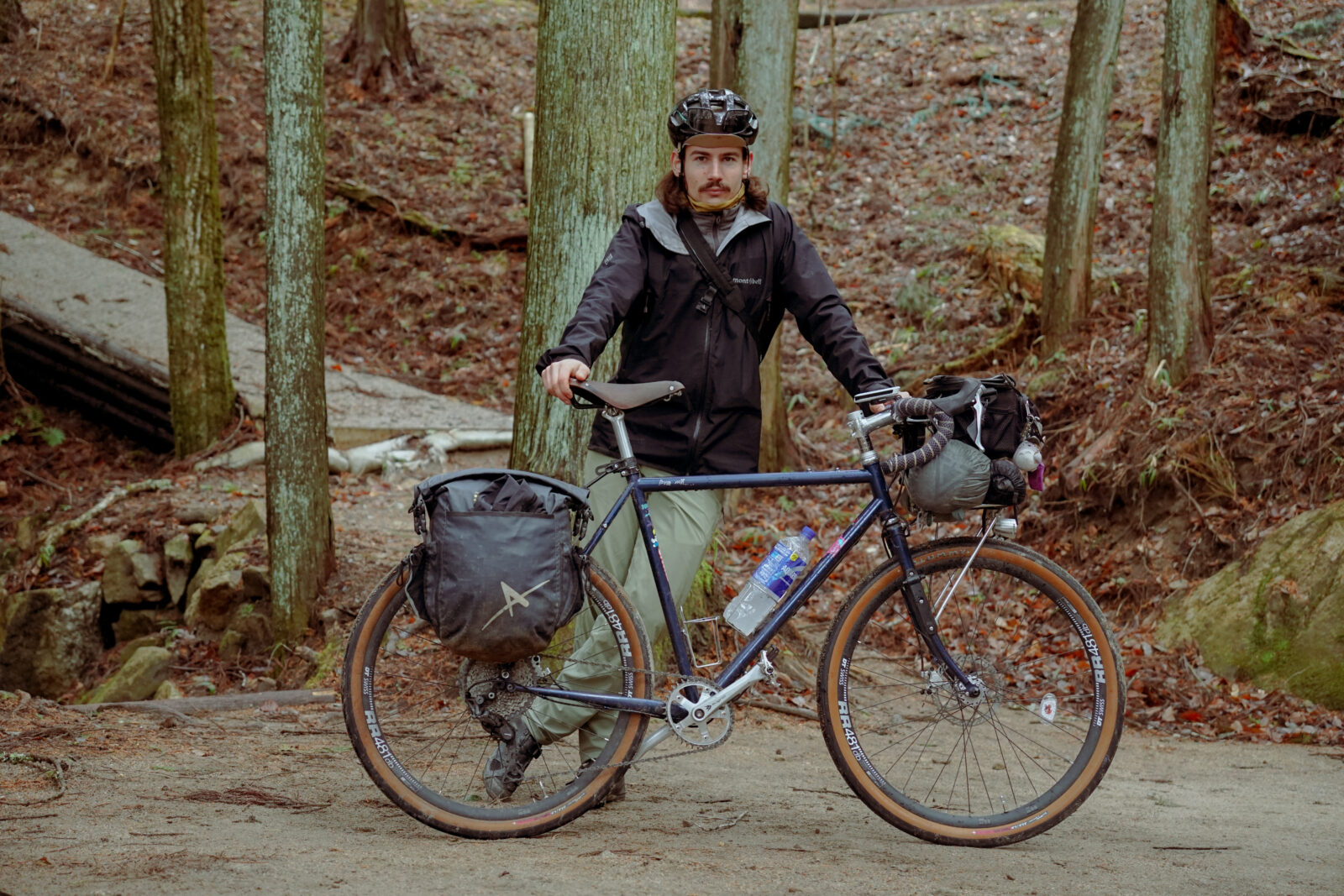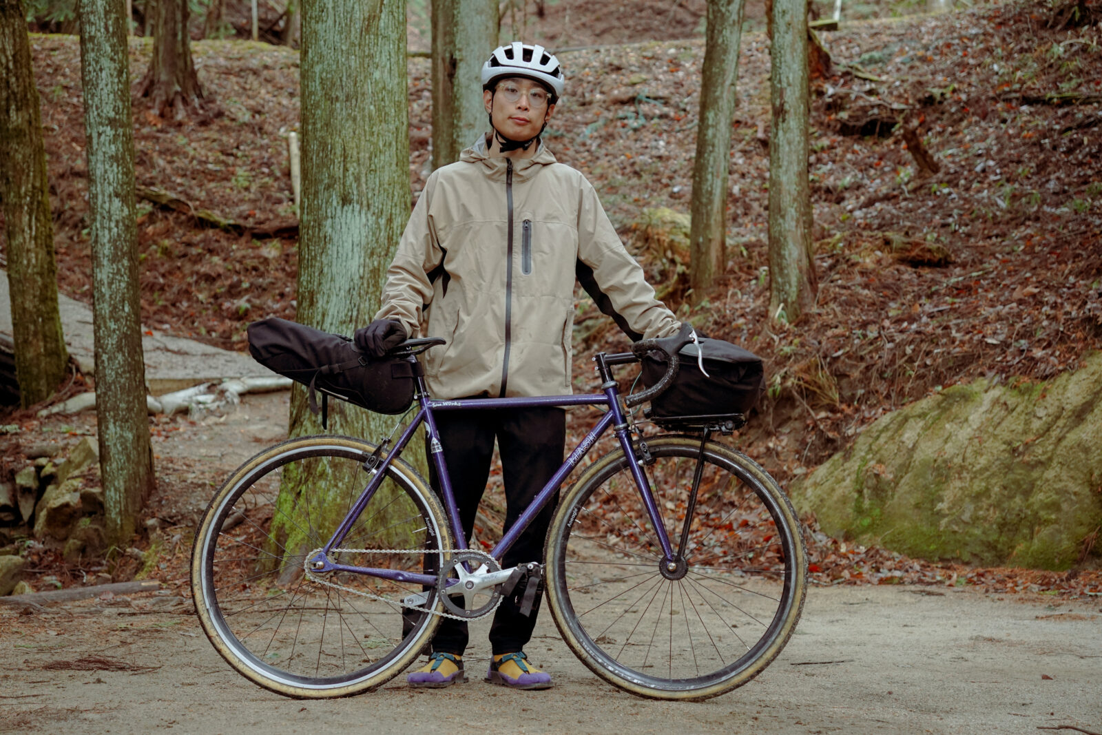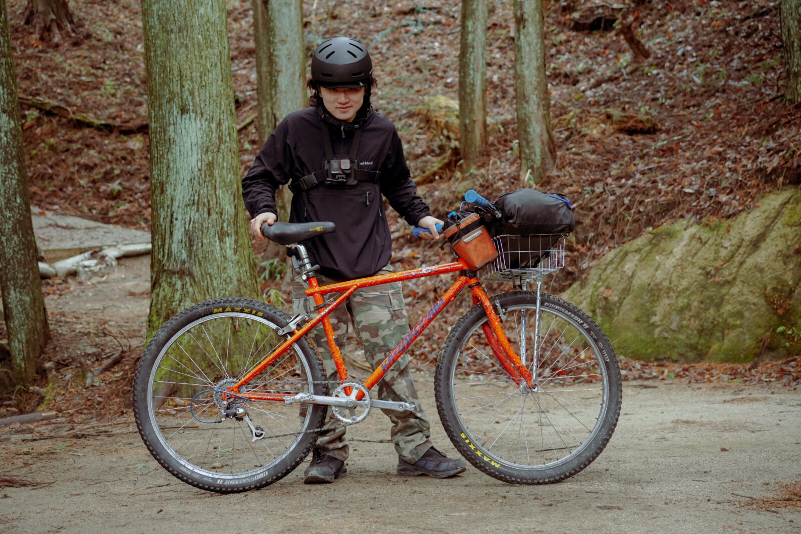 もう一人は、ヘルメットからあふれる自由な髪が印象的な、若々しくエネルギッシュなハルが、90年代のGTカラコルムに跨っている。オレンジ色の爆竹のようなバイクは、前夜から真夜中まで改造したばかりだった。彼にとって初めてのバイクパッキング体験で、興奮が伝わってくるようだった。