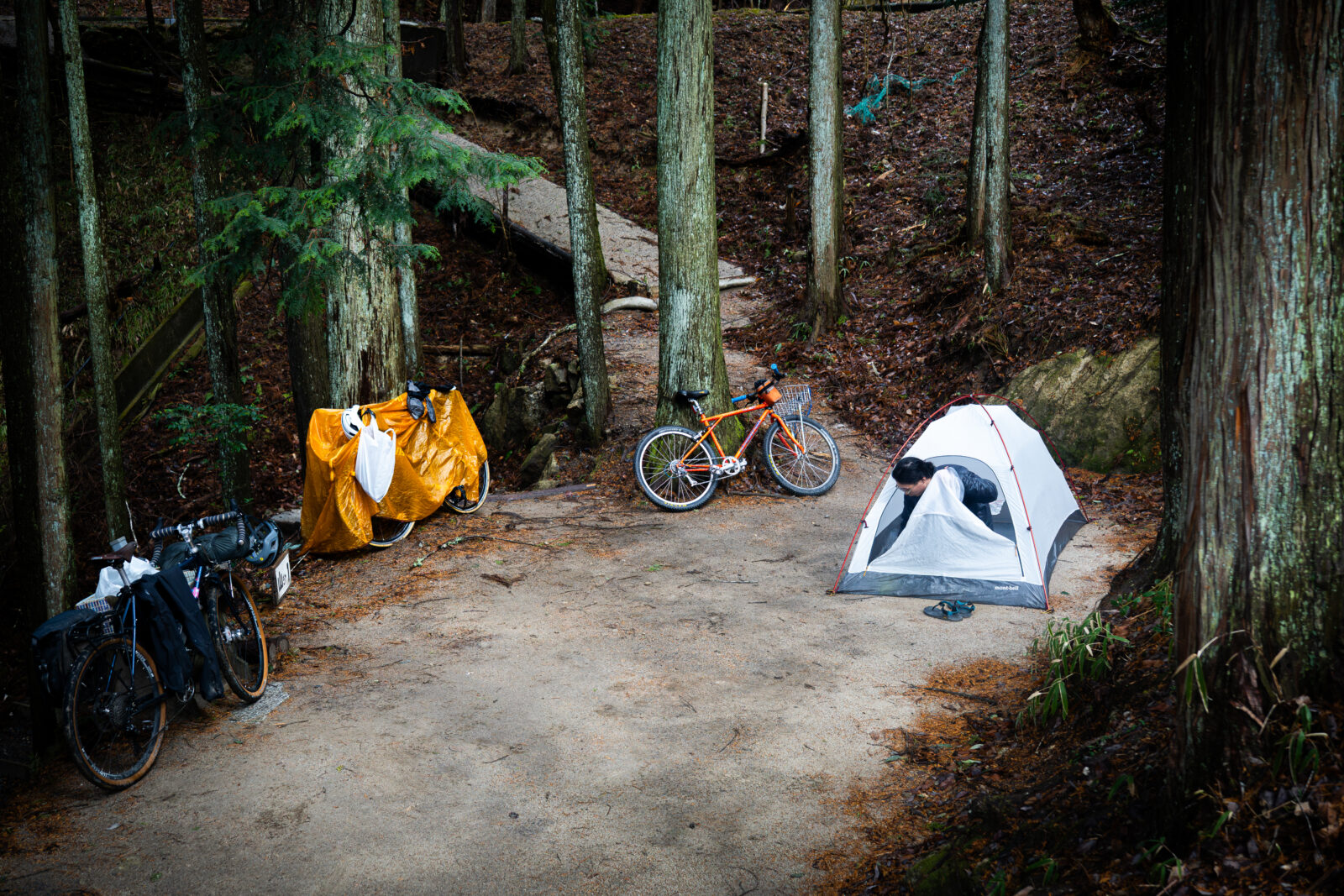 Le jour J nous sommes trois, comme les mousquetaires, armés de nos vestes de pluie et d’un grand sourir perçant les nuages. D’un côté il y a Baki le sage, toujours plein d’humilité et de gentillesse, vêtu de “simples” sandales et dépourvu de vitesses sur son destrier de fer floqué Mash. De l’autre côté, le casque débordant d’une chevelure rebelle se trouve le jeune et dynamique Haru sur son GT Karakoram des années 90, une bombe orange remise au goût du jour la veille jusqu’à minuit. C’est sa première expérience en termes de bikepacking et son excitation est palpable.