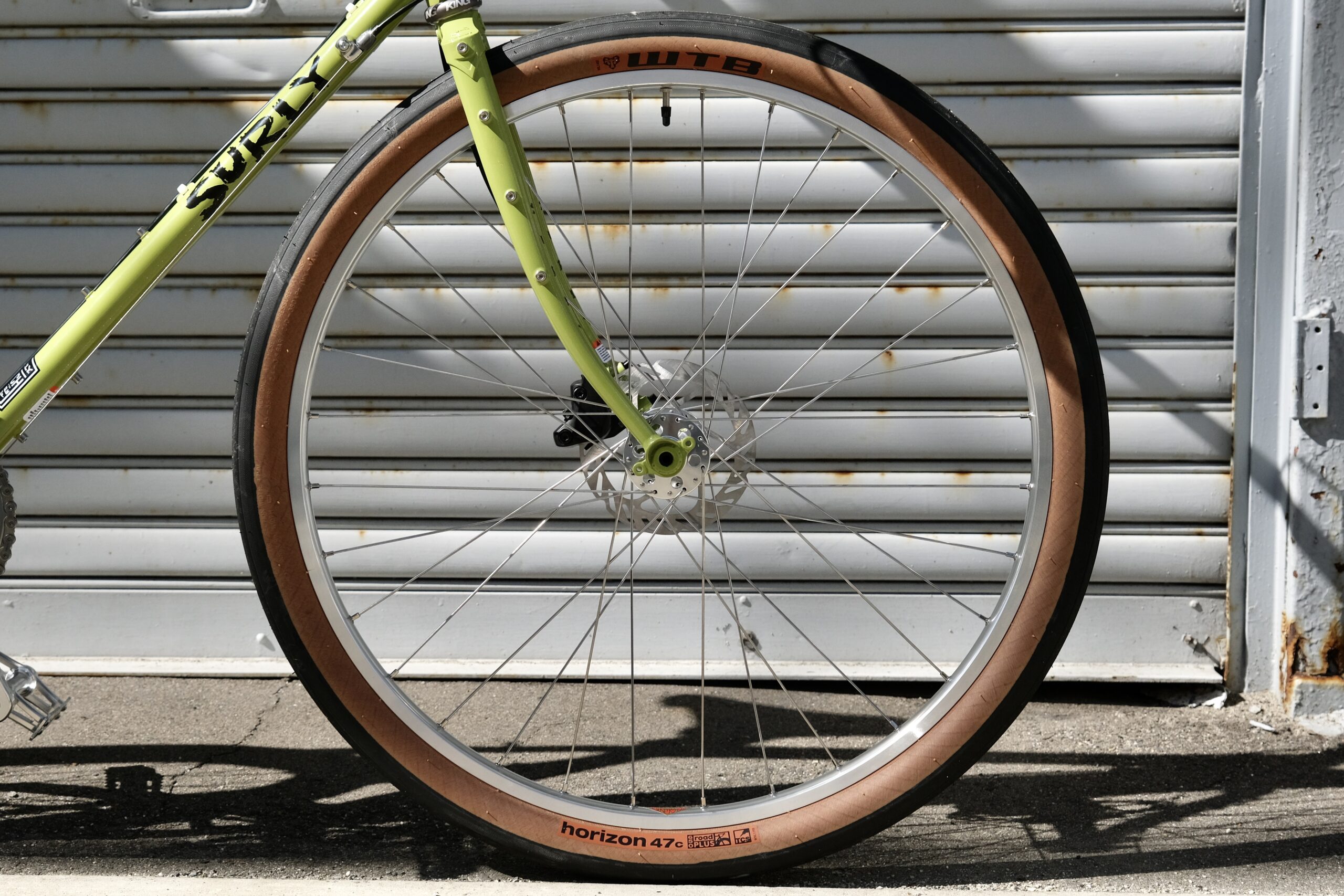 センタースリックとヘリンボーンパターンを組み合わせたホライゾンは、舗装路での転がり抵抗を最小限に抑えつつ、雨天や未舗装路でも確かなグリップを確保します。