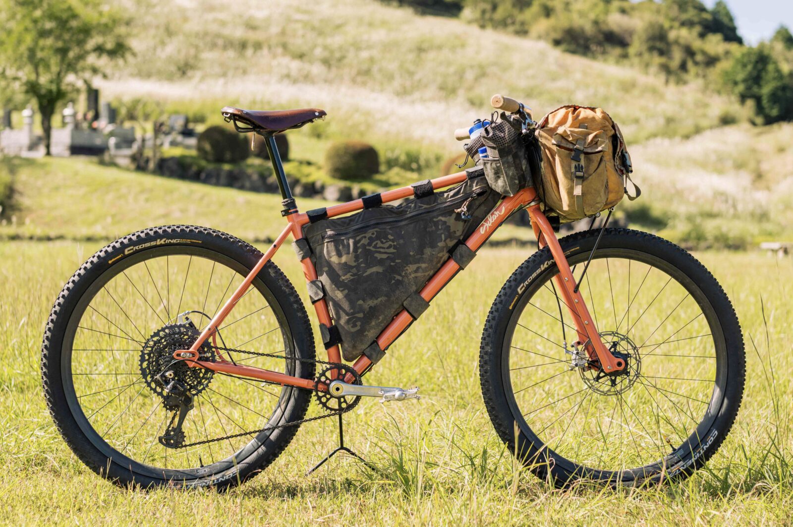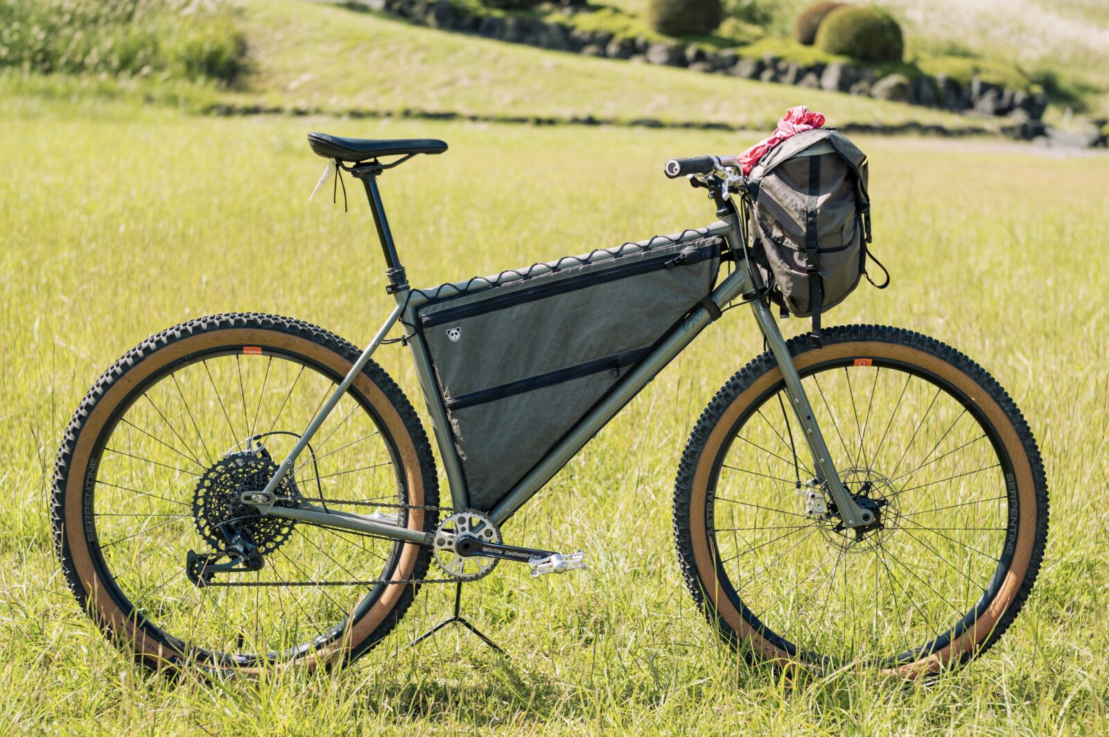 サイズが大きいからヘッドチューブも長いので、バッグサポーターがなくてもハンドルバーバッグがタイヤと接触する心配もなく安定したり、フレームバッグもこれだけ大きいとしっかり積み込めて羨ましい。