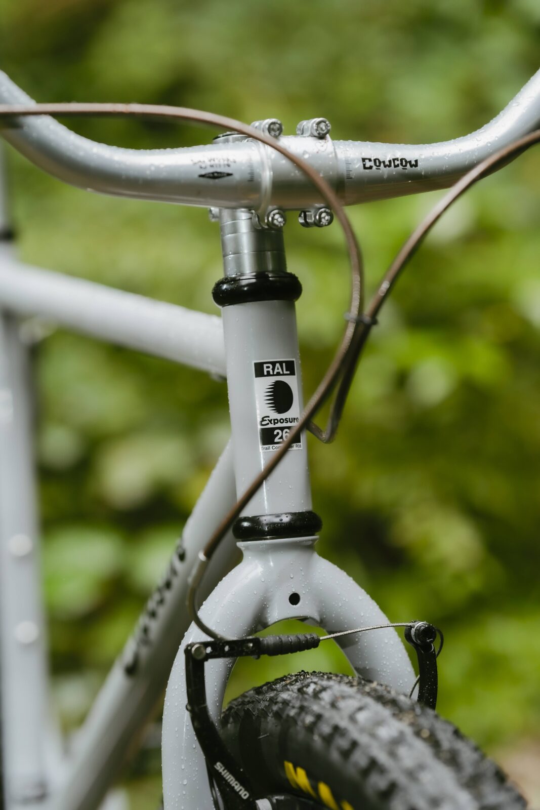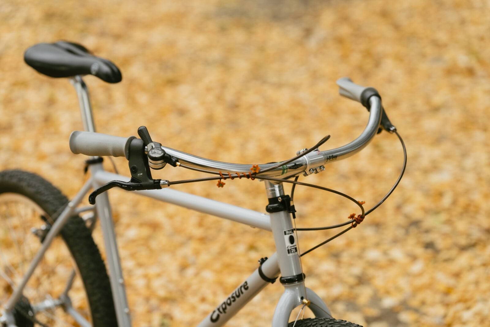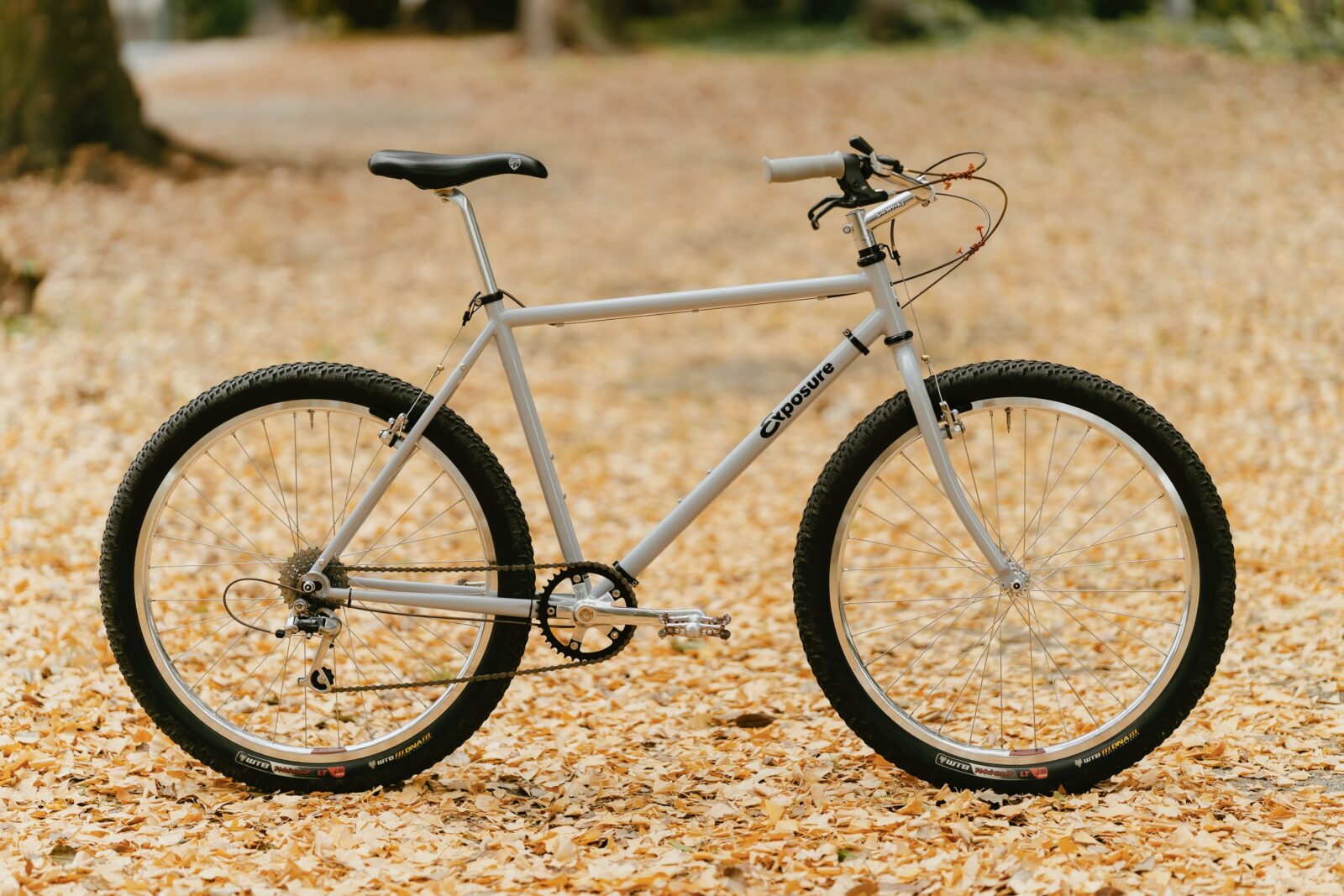 ハイライズなハンドルに太めのブロックタイヤを履かせて、すぐにでもトレイルに突っ込んでいけるようなイメージ。