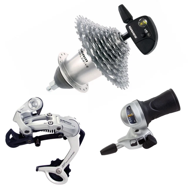 Dans les années 80 les dérailleurs se perfectionnent et offrent une plage de développement plus grande d’année en année. A côté de dérailleurs 7 vitesses, la Torpedo de Sachs ressemble plus à un jouet qu’à une solution viable et devient de moins en moins courante. La grand-mère n’a pas de descendance et Sachs s’en mord les doigts. Alors pour faire face à tous ces nouveaux dérailleurs beau-gosses, ils lancent un concept mêlant le meilleur des deux mondes, le moyeux 3×7 (plus tard SRAM Dual Drive), le Arnold Schwarzenegger des moyeux à vitesses. Tout droit sorti du futur tel un terminator ce moyeux combine trois vitesses internes ET septs externes; nombre qui augmentera au fil des ans allant jusqu’à 3×9.