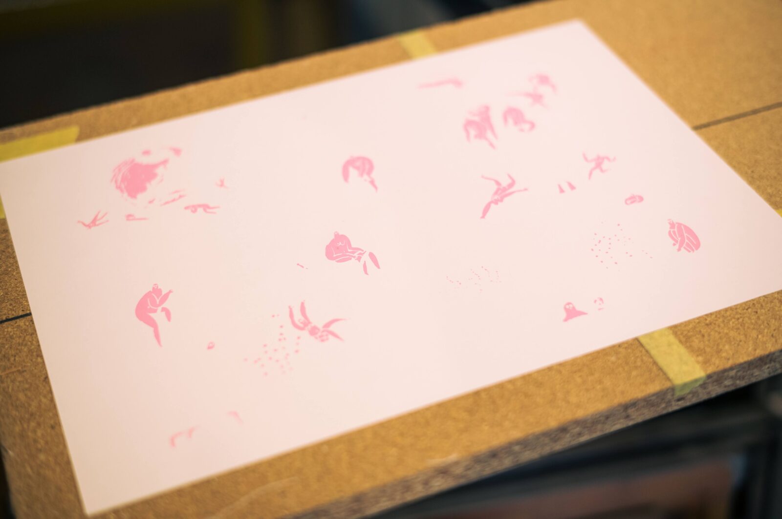 舞さんの絵を表現するために、通常盤より密度の濃いメッシュを使用し、それに合った少し固めのインクで表現してくれました。普段より強い力で印刷する必要があるそうです。確実にインクを落としつつ、インクが落ちすぎないような塩梅を探るのに苦労したそうですが、そんな裏話が聞けるのも手仕事ならではですね。