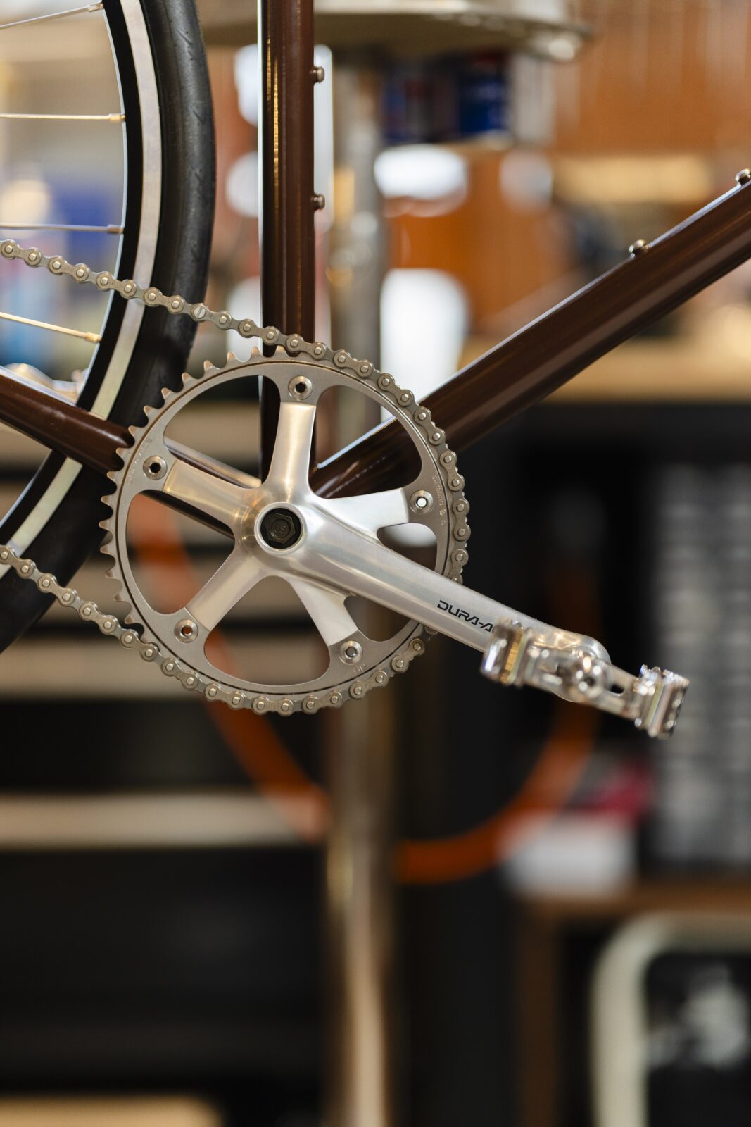 そしてクランクとハブにはにはDura-Ace Track シリーズを。競輪で使用される優れた機能性を備えたものですが、伝統的な形状は兎に角美しく、目を奪われるものです。そして、フレーム、そしてその他のパーツとも相性は抜群、良く似合います。