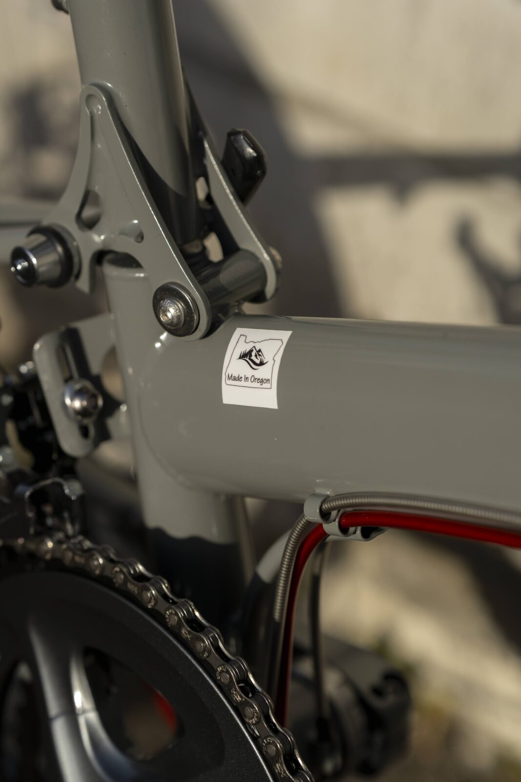 ドルフィングレーのフレームに、シルバー系のパーツ、赤色をアクセントにしたコンビネーションが素敵な1台です。