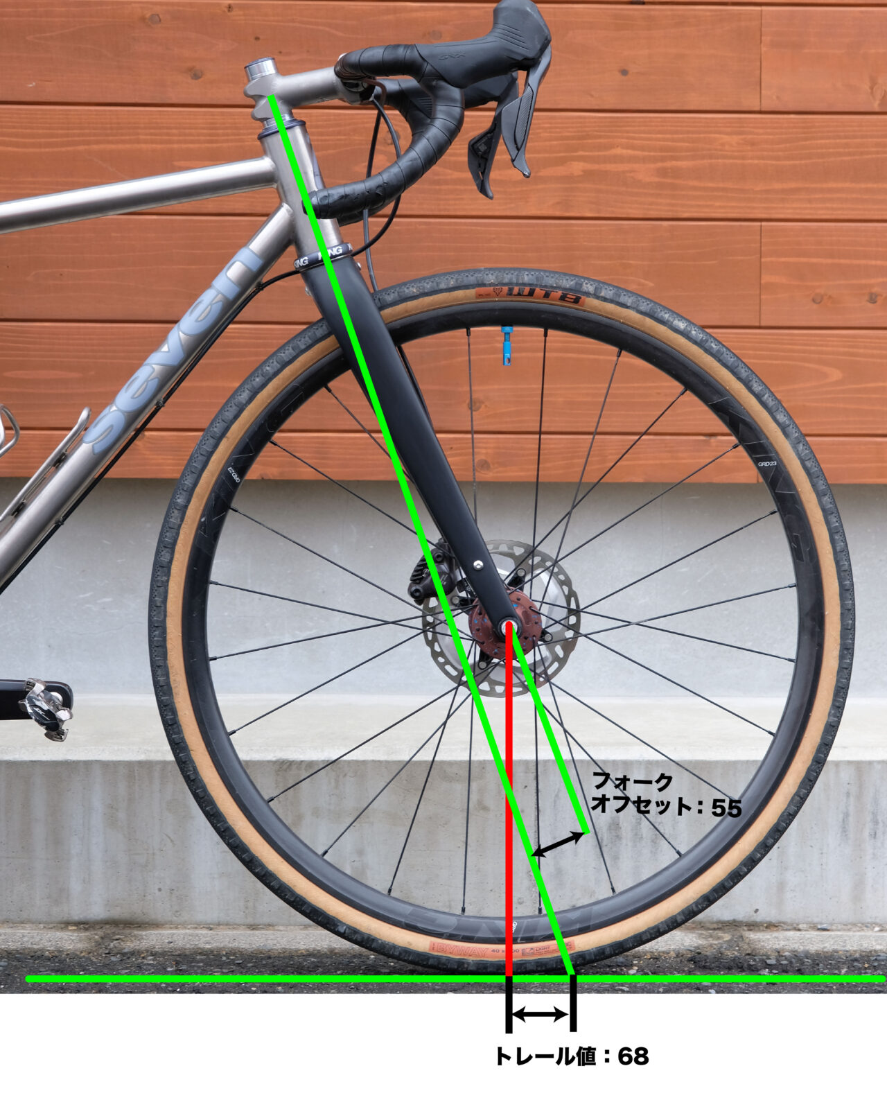 ヘッドアングル、フォークオフセット、どちらもハンドリングに影響を与えるものなのですが、トレール値はそれらを踏まえて導き刺された数値で、それが指標となり、どんなハンドリングなのかがイメージできるのです。ただ、そのトレール値を導き出すのには、ヘッドアングル、フォークオフセットの2つの数値に加えて、タイヤの外周の数値が必要となってきます。