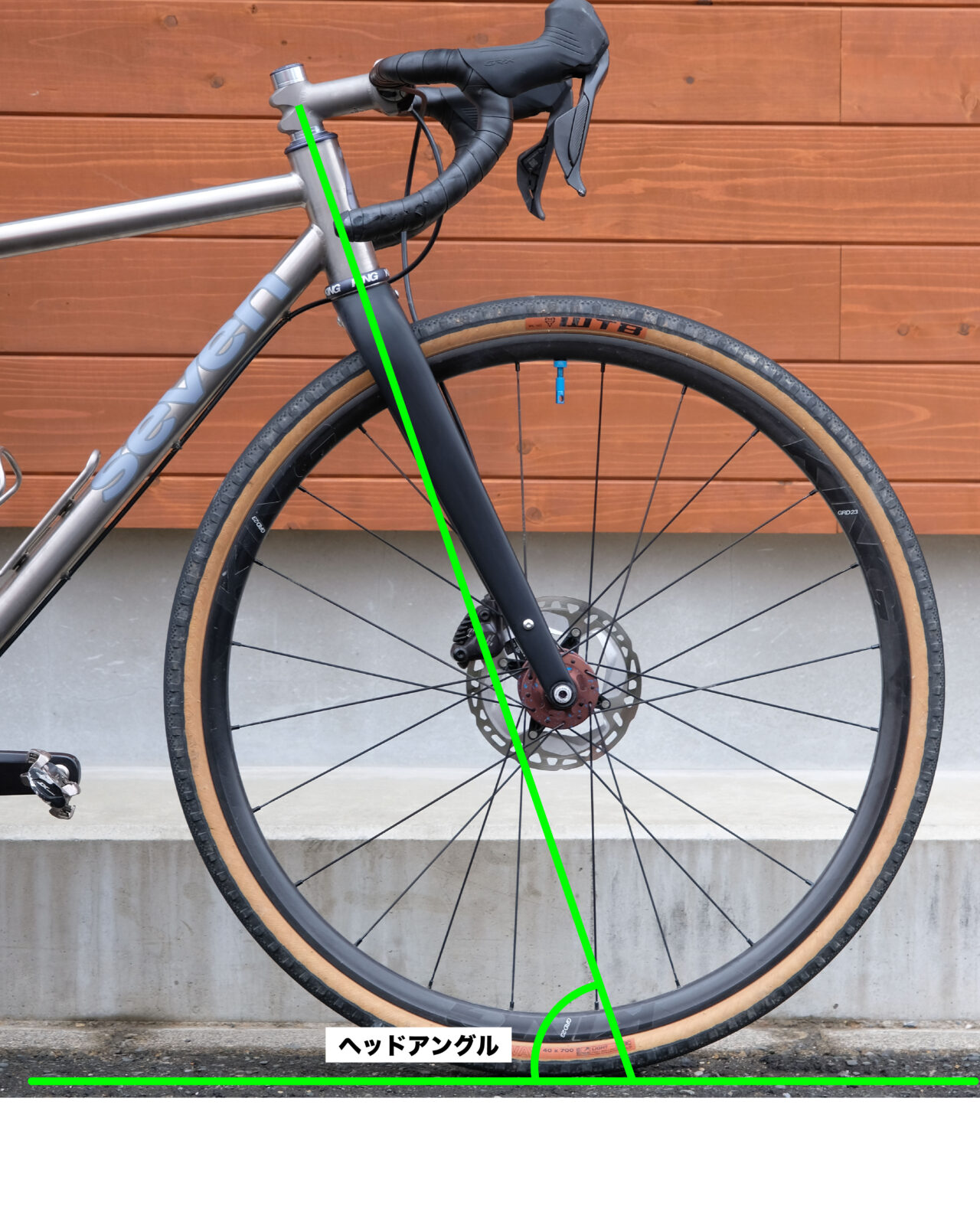 フレームのヘッドチューブと地面が成す角度のことです。この角度はハンドリングの軽快さ、直進安定性、振動吸収性に大きく影響します。この角度が大きい(立っているとも表現します。)とハンドリングがクイックで、上り坂に強く瞬時の加速もしやすくなります。逆に小さい(寝ているとも表現します。)とハンドル操作は穏やかで直進安定性が増します。