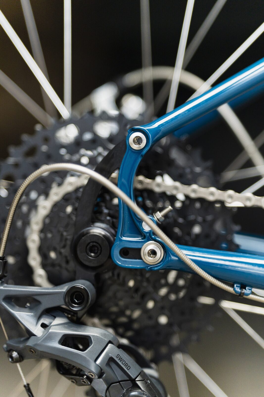 初期のセッティングでは、シングルスピードでのアッセンブルを想定したSwinger Dropoutが装着されていますが、今回は付属しているディレーラーハンガー付きのドロップアウトを装着し、ギアードでのアッセンブルとなりました。