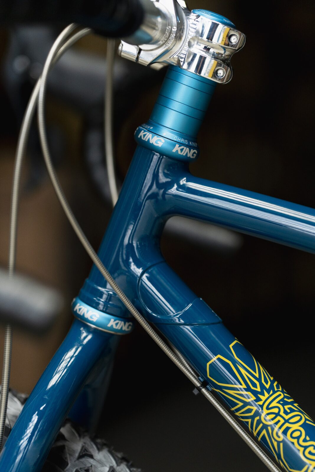 ヘッドチューブには、オリジナルのラグが用いられ、加えて、溶接痕のわからない滑らかな仕上げとなったフィレット溶接で仕上げられたその姿はとても美しいものです。その拘りと制作に対する熱量が伺えます。