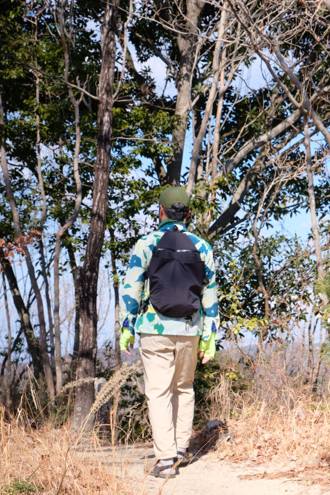 Bese in Vestのフロント部分には、スマートフォン、補給食、手拭い、モバイルバッテリー、財布、鍵…フロントのポケットに収納したのは前日のハイキングとほぼ同じ内容物ですが、加えて先日購入した45NRTHの厳冬期用のグローブ、そして20年ほど使用しているウール素材のベストを背中のポケットに収納していました。この2つのアイテムがあったおかげで冷たい風は吹き付ける下りも安心。また、山頂で凍えることもありませんでした。Patagoniaのシェルも脱いだり着たりしていましたが、収納する時は背中のポケットを利用していました。この背中のポケットがなかなか収納能力があって助かります。
