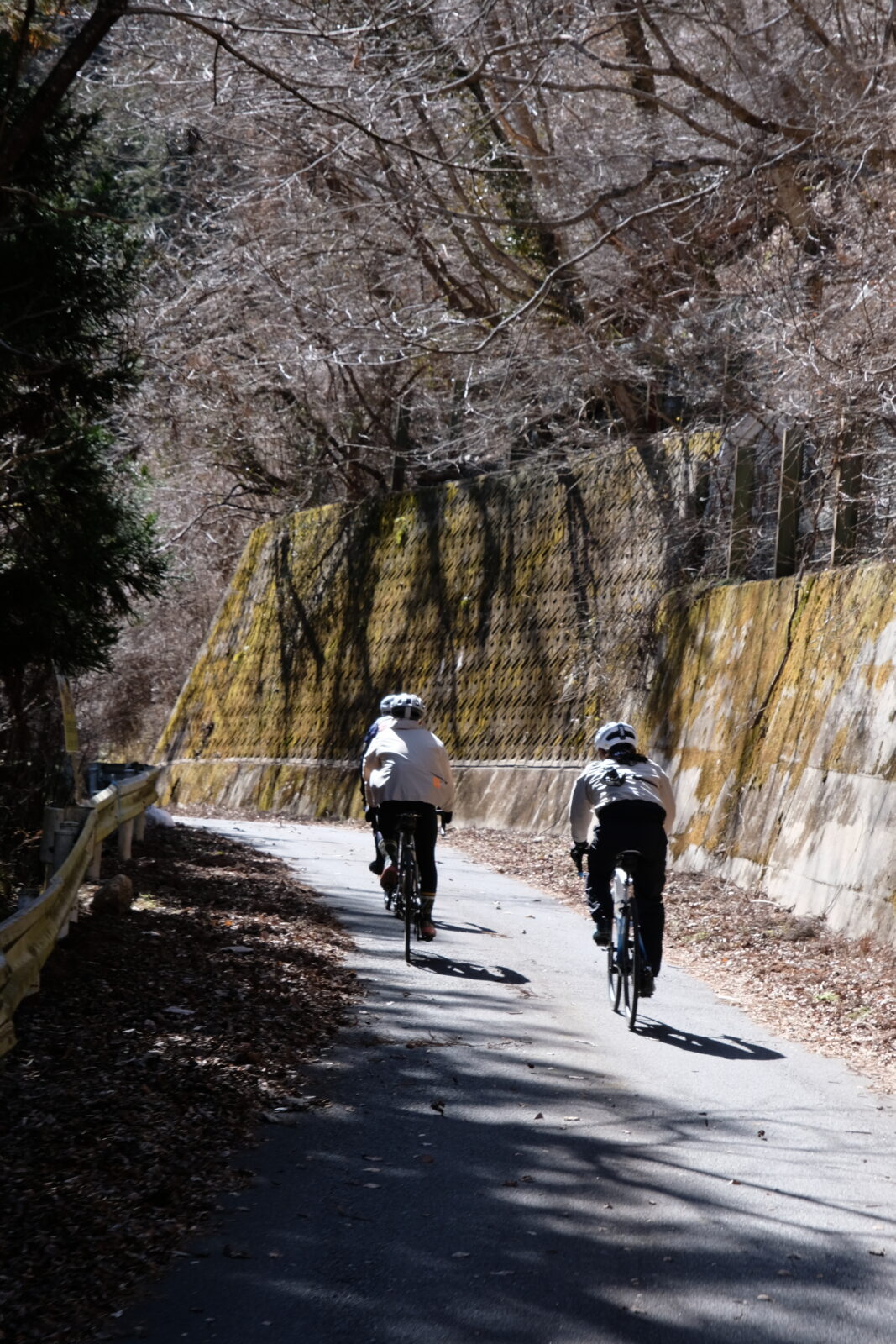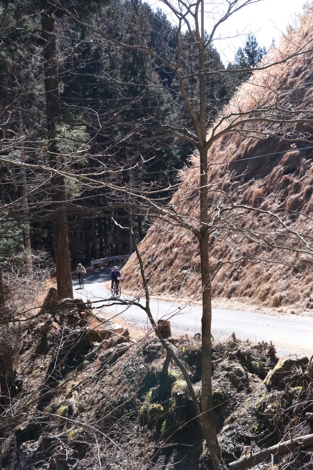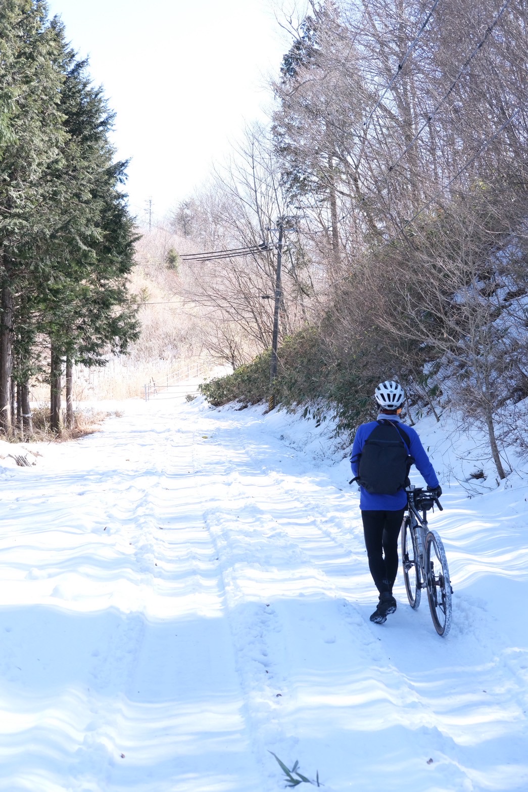 それまでは、平坦とは言えないくらいの緩い登り基調の道が続きますが、ここからは、一気に標高を上げていきます。距離は9km弱、ただひたすら登るのみ。山頂付近は1100mほどの標高となります。ちょっと嫌な予感はしていましたが思った通り、山頂に近づくにつれ、陽の当たらない場所は凍結しており、山頂付近は自転車に乗る事が難しい箇所が幾つもありました。