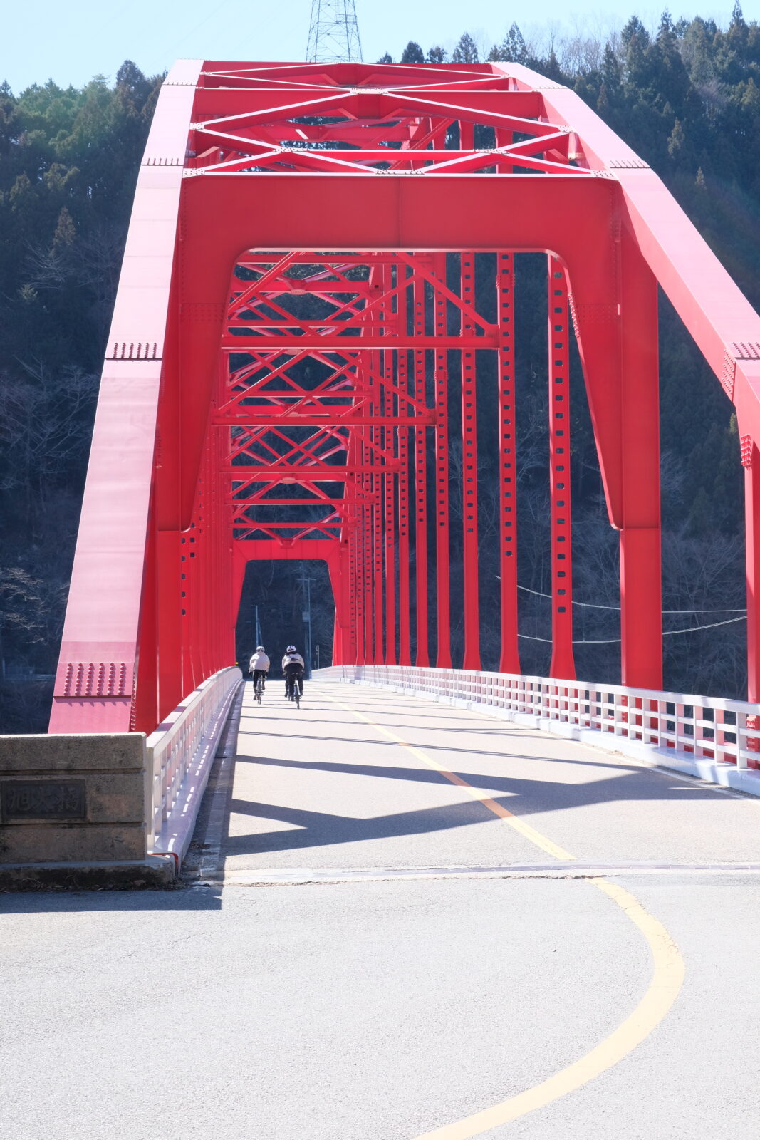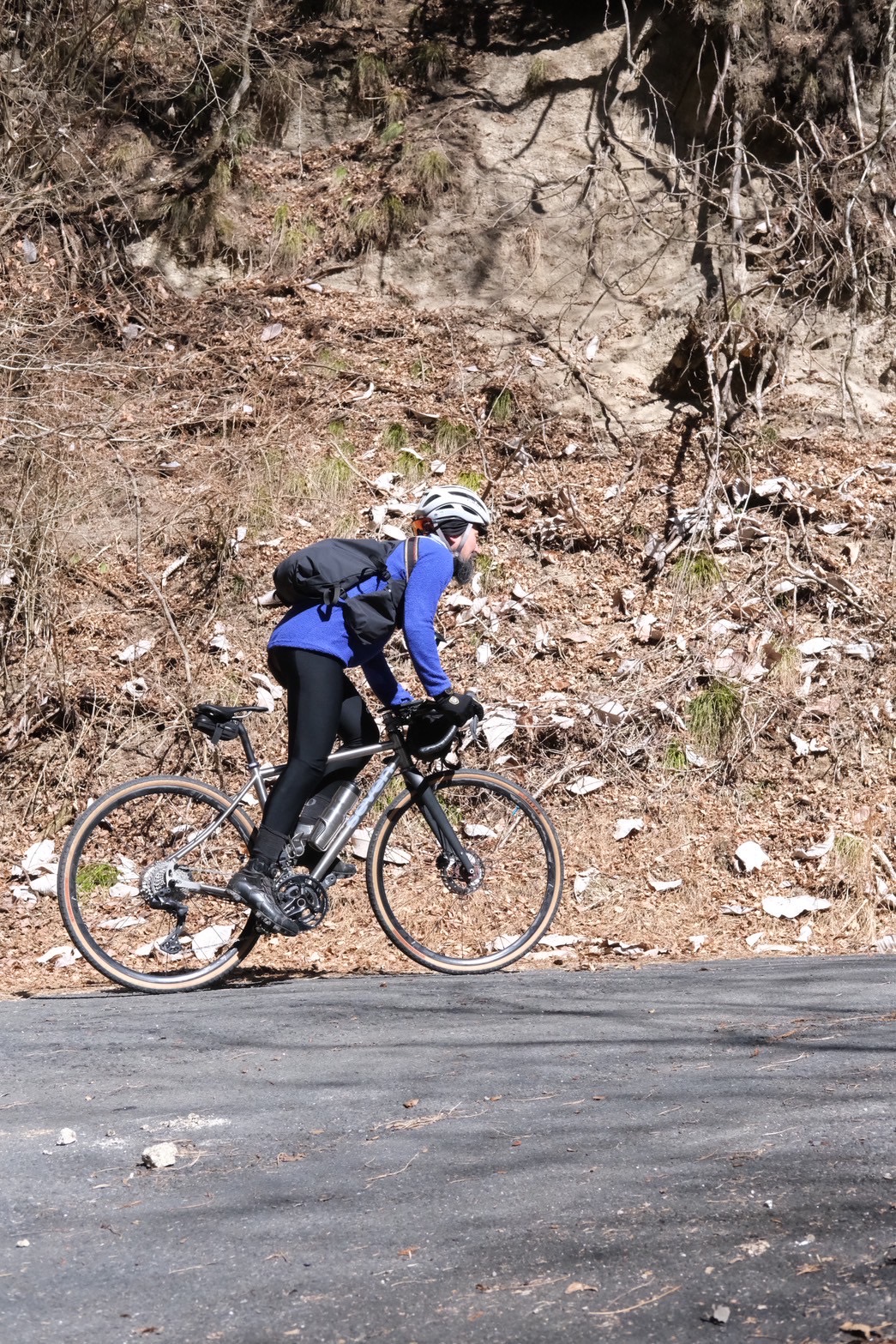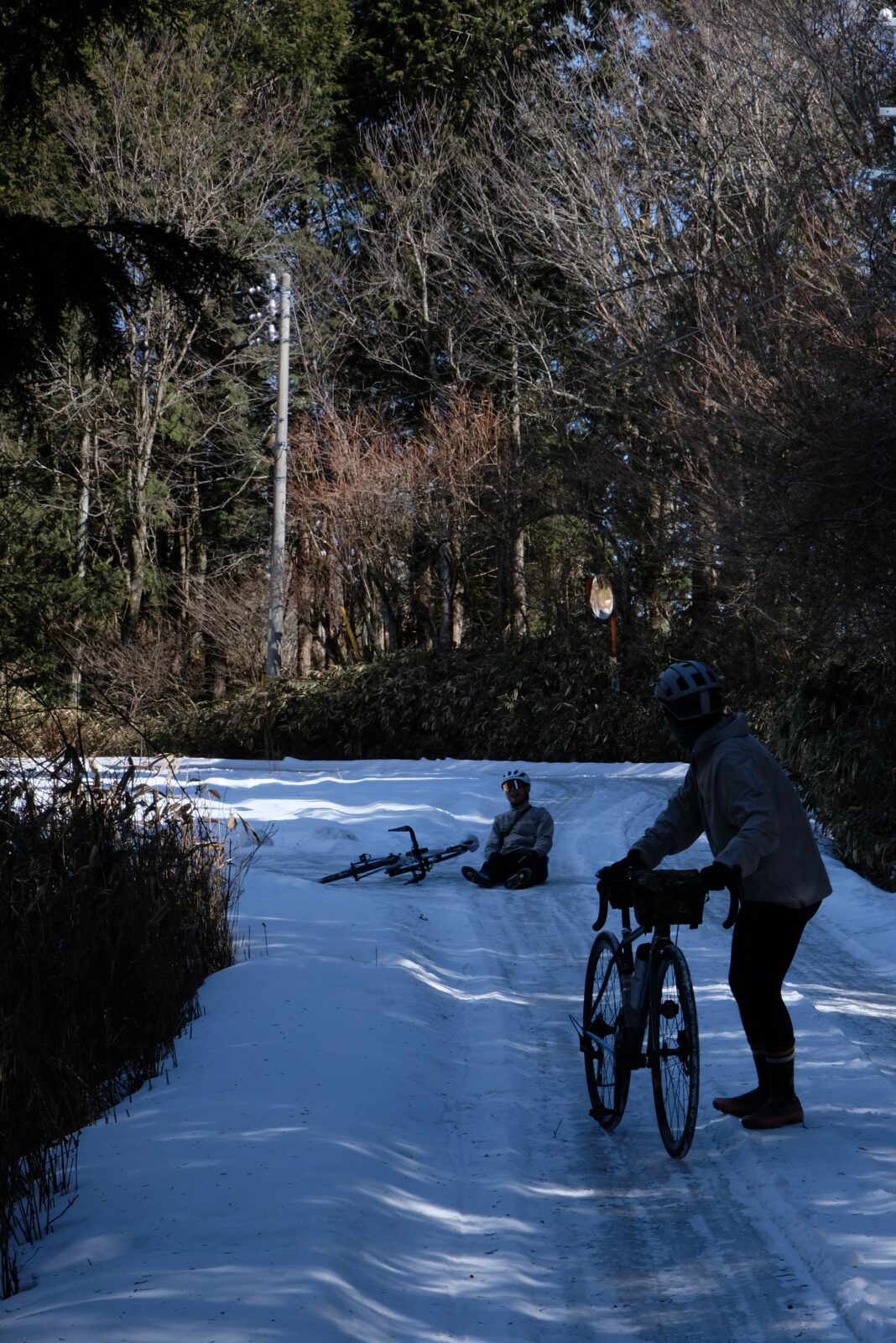 それまでは、平坦とは言えないくらいの緩い登り基調の道が続きますが、ここからは、一気に標高を上げていきます。距離は9km弱、ただひたすら登るのみ。山頂付近は1100mほどの標高となります。ちょっと嫌な予感はしていましたが思った通り、山頂に近づくにつれ、陽の当たらない場所は凍結しており、山頂付近は自転車に乗る事が難しい箇所が幾つもありました。