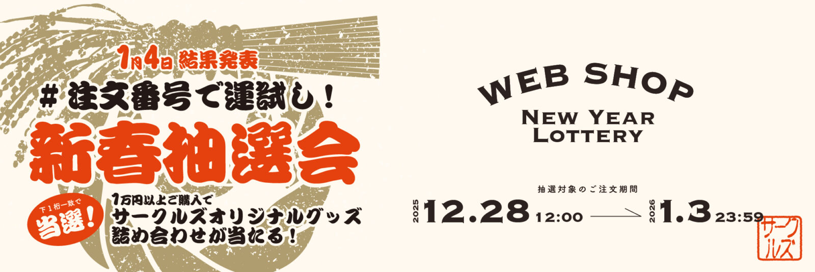 ウェブショップでお買い物をすると発行される 注文番号#000000 を対象とし、下一桁の番号を2025/1/4に抽選で選びます。1万円以上お買い上げ+下一桁が一致した注文番号で注文された方にサークルズオリジナルグッズ詰め合わせをプレゼント!