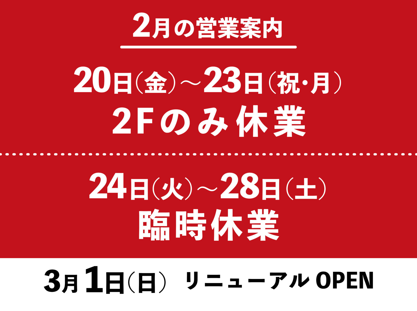 その準備期間として、下記の期間を臨時休業とさせていただきます。
